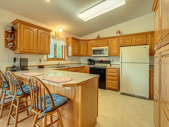 The kitchen offers plenty of cabinets, easy care flooring, pantry and sit up breakfast bar. The open concept from the kitchen and dining room with vaulted ceilings offers patio doors leading to a deck overlooking the yard with sprinklers. Two bedrooms on the main level including the primary bath w/ 3/4 bathroom and walk in closet. Main floor laundry in hall closet and full bathroom complete the main level. Downstairs you will find a spacious family room with daylight windows, 2 additional bedrooms and another bathroom. Shingles and AC were replaced in 2016.