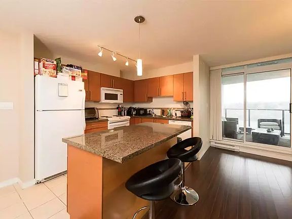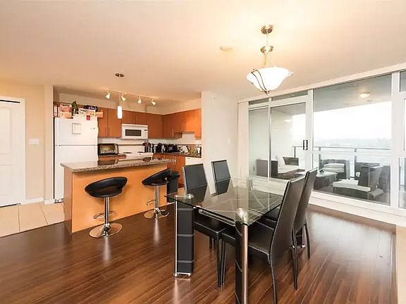 Beautiful & bright suite with open kitchen, dining room & huge living room, cozy gas fireplace, bright floor/ceiling windows, large courtyard garden area next to gym with hot tub/sauna. 2 secure U/G parking & one storage locker. Great location adjoining Holdom Skytrain station & all bus links