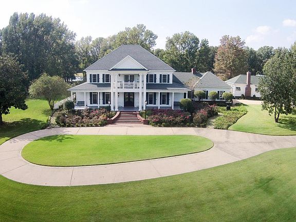 Just 25 minutes to East Memphis or to Downtown... A one-of-a-kind Architectural Masterpiece, a Timeless Treasure, a rare delight in Luxury Living in this 6000 SF Southern Colonial home positioned 950 feet from the road on 8 Acres behind an electric security gated entry, this property will leave you speechless from the moment you arrive ~ A lighted driveway with timers takes you to a Circular Drive where a 62 Foot Wrap-Around Front Porch welcomes you home ~ Grand 2-Story Entry with stunning Waterford-like chandelier and a gorgeous circular staircase with decorative hand-made trim ~ Painted wall treatments by noted movie/film artist in the Formal Dining and throughout ~ Open Chef's Kitchen with Copper counters, Thermadore Double Ovens, Infrared Cook-Top, and Built-In Sub-Zero Fridge,