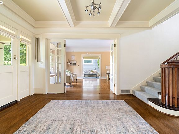 Timeless grandeur blends seamlessly with thoughtful modern upgrades in this remarkable 4,404 sqft Irvington classic. Set on a generous 6,500 sqft lot, this Colonial Revival with Craftsman influences offers 5 bedrooms, 4.5 bathrooms, and a wealth of historic details blended with today's luxuries. Step onto the broad front porch & through the stately entry to find soaring ceilings, box beams, wainscoting, pocket doors, and a sweeping staircase. Built-ins, benches, parquet floors, and a clawfoot tub further showcase the home's heritage, while a spacious remodeled chef's kitchen anchors the heart of the house, featuring a commercial-grade 50,000 BTU gas range, stainless steel appliances, and Caesarstone countertops—a perfect balance of historic warmth & modern efficiency. Upstairs, the primary suite is a private retreat, offering a sitting room/den, vaulted ceilings, skylights, custom mahogany built-ins, and a spa-like bath with a wood-grain tile shower, soaking tub, and double sinks accented by handmade inlaid wood. A walk-in closet with its own full laundry adds rare convenience. Each additional bedroom on the 2nd level features its own walk-in closet, ensuring space & functionality throughout. The lower level is designed for entertaining, featuring a family room & pub-style lounge with a Bubinga wood bar, a 3,000-bottle wine cellar, a wet bar with a beverage refrigerator, and a kegerator. A full laundry with a utility sink, a bedroom, and a workshop with 220v current complete the level, offering both luxury & utility. Outdoors, the home extends its hospitality with mature landscaping, a spacious backyard featuring a deck & patio, and multiple porches—including a portico off a 2nd floor bedroom & a covered porch extending off the living room. The rare two-car garage, finished with an EV charger, adds modern comfort. Situated in Portland's coveted Irvington neighborhood, blocks from the Irvington Tennis Club, New Seasons, cafés & restaurants. [Home Energy Score = 1. HES Report at https://rpt.greenbuildingregistry.com/hes/OR10241590]