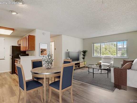 Turnkey. Updated. Convenient. This thoughtfully renovated and tucked away corner unit is all those things and more! Brand new flooring, trim and interior paint have elevated and freshened this space by creating continuity and brightness. Granite countertops, black appliances (brand new fridge!) and real wood cabinets adorn the cozy yet functional kitchen, with the adjacent wall closet available for a pantry, storage, or coats...you decide! The dining and living room combo is just "easy"; it fits furniture well and has enough wall space for that big TV you either have or have always wanted! Additional storage options can be found in the hallway, by way of another double-door wall and a smaller linen closet. The full bathroom boasts a larger, refurbished vanity that offers treasured counter space, and the brand new toilet is a nice bonus! Lastly, the two bedrooms are located at the end of the hallway, thereby providing some separation from the main living area. Each room is unique in its own right: one feels a little more private and practical with it's custom closet organizer; the other feels airy and open with its access to the covered balcony. Although staged as a bedroom, it would also make a great office or flex space. Additional conveniences are a covered carport spot, a dedicated storage closet and trash chute on the same floor, and access to Denver, the High Line Canal Trail, RTD, and numerous places to eat and shop. Let this be your new home! Just. Say. Yes.