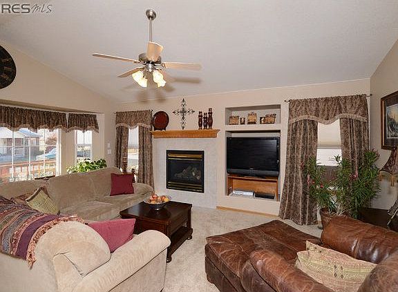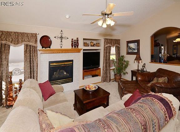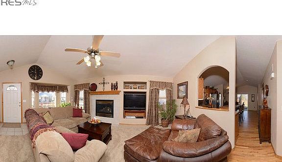 Ranch Style w/ open floor plan, vaulted ceilings, custom Tharp cabinets, kitchen Island, hardwood floors, gas fireplace, main floor laundry, 5 pc master suite w/ walk in closet. 3 beds and full bath on main level. Basement has 9' ceilings, large family room, 2 bedrooms & office. Wired w/ cat 5, 725 sqft garage w/service door to fully fenced rear yard w/Mtn Views. Home faces South; No home backing to property. Updated roof/gutters in 2011.