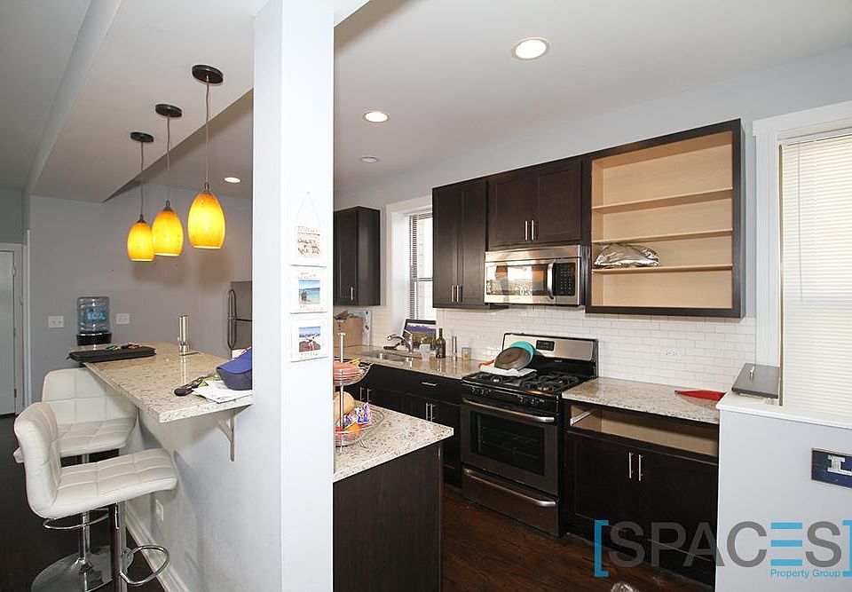 2 bedrooms, 2.5 bathrooms Duplex Ukrainian Village: Rice @ Leavitt Updated kitchen with S/S appliances including dishwasher and microwave Breakfast bar Granite counters Large living space with high ceilings New bathrooms with Master en suite Large King size bedrooms Central HVAC Two private porches Outdoor parking included Laundry in unit Pet friendly