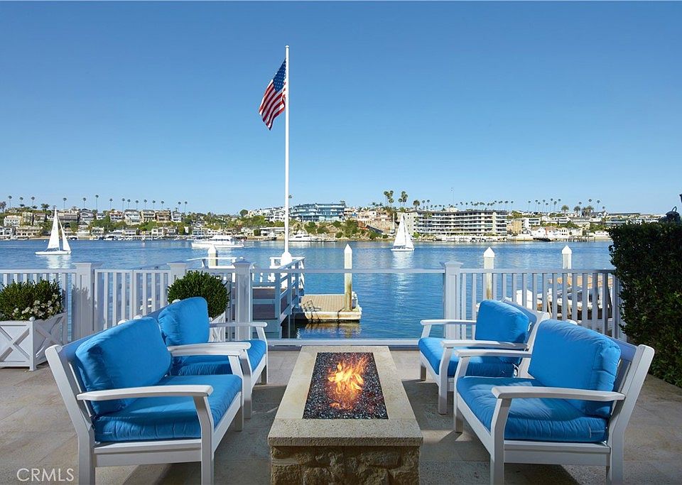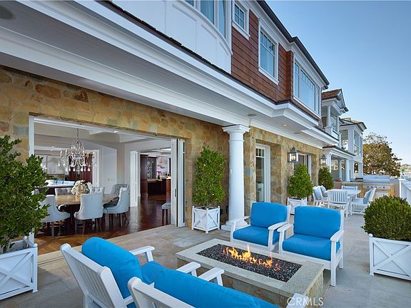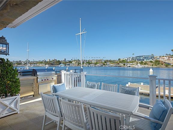 The pinnacle of Newport Beach living awaits at this picture-perfect bayfront home on the southern tip of the Balboa Peninsula. Offering 53' of frontage on the water and a private dock that can accommodate a vessel up to 45', this luxurious New England Coastal-style residence by Patterson Custom Homes impresses with panoramic channel views that encompass evening lights reflecting on the water, China Cove Beach in Corona del Mar, and Newport Bay’s access to the Pacific Ocean. Magnificent vistas can be enjoyed from both levels of the home and its rooftop, where 360-degree views can be savored from a bubbling spa. Spanning approximately 6,164 square feet, the shingled design impresses at first sight with stone accents, a slate roof, and a private, gated front patio featuring a welcoming Dutch entry door. A two-story foyer with a sweeping curved staircase opens to an interior adorned with handsome wood flooring, elegant custom millwork including crown molding and wainscoting, coffered ceilings, and exquisite hardware, fixtures, and handcrafted finishes. Five en-suite bedrooms and five-and-one-half baths include a main-level suite, and a bay-view primary suite with a fireplace and vaulted and beamed ceiling. A loft, custom home office, and bonus room/optional sixth bedroom offer versatility throughout. Entertaining is easy in a massive great room that opens to a large deck overlooking the bay and features a walk-in wet bar, fireplace, and direct access to a large fireplace-warmed dining room. The kitchen flows effortlessly to the great room and dining room, styled with features reserved for today's finest residences, including a grand island with bar seating and farmhouse sink, marble countertops, a full backsplash, butler’s pantry with utility sink, custom white cabinetry, built-in flush-mount Samsung TV, and top-of-the-line appliances like a built-in Miele coffee station, six-burner Wolf range with two ovens, a separate Wolf oven, warming drawer, and Sub-Zero beverage cooler.