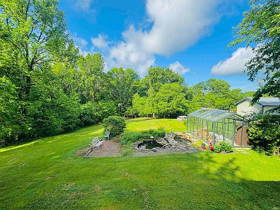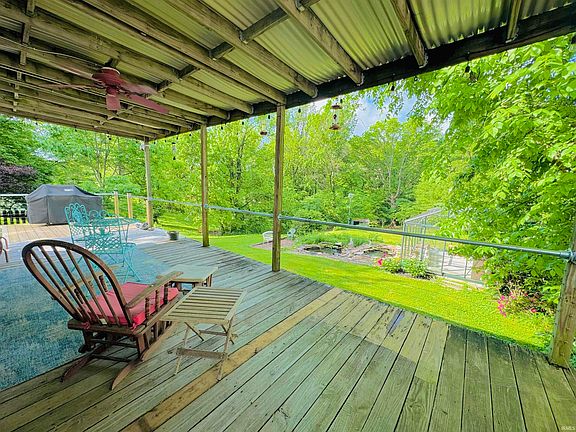 This remarkable 2 bedroom 1.5 bath sits on almost an acre on Evansville's West side on Harmony Way. With its beautiful yard space and generous deck, you will love the views and peace to be had. Inside the front door you'll find one of two large living spaces featuring two wonderful bay window seats and a custom bookcase/workspace partition. From there you will find an open dining/kitchen area with ample cabinets and a gas double oven/range. Opening into the 2nd living space, the great room, you will find a breakfast nook with custom built benches flanked with two picture windows letting in tons of light and beautiful views of the back and side yard. The great room features a stunning brick fireplace and built-in bookshelves. The two bedrooms are located off first living space and offer both bathrooms steps from each bedroom. The kitchen also has a hidden cellar door set in the floor that will open to stairs down to a large basement perfect for storage or future plans to finish it out and provide more square footage and living space to the home. Out the back door you'll find a huge, covered deck perfect for entertaining that extends around to half the side of the home. The side deck overlooks the additional yard barn and fenced-in side yard, while the back of the covered deck overlooks the large backyard and woodline, decorative waterfall pond and a stunning Victorian iron greenhouse. Sale of home includes Stove/Oven, Refrigerator, Dishwasher, Microwave, Trash Compactor, Washer and Dryer. This house is ready for its next owners to fall in love with the beauty and peace it offers.