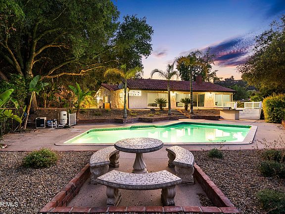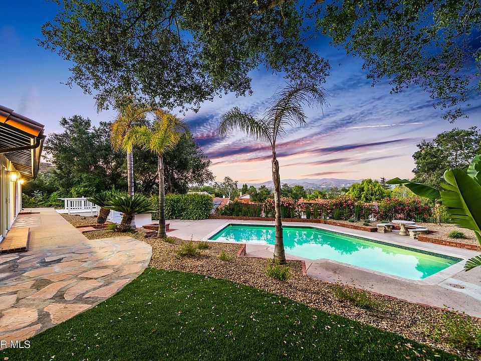 Welcome home to this fully furnished private retreat situated on a almost half an acre of resort-style grounds with Panoramic Views of Westlake Village. Tucked away on a gated flag lot in the hills of Westlake Village this home has a fantastic open floor plan which provides an indoor/outdoor lifestyle. Oversize sliders open up to an entertainers yard with beautiful pebble tech pool, built in BBQ/ Fire pit, and large usable turf yard shaded by a gorgeous oak tree. The living room has a contemporary floor to ceiling 2 way fireplace and high ceilings that over looks the pool and view. The spacious primary suite offers a walk-in closet and fully updated bathroom. This Westlake Oasis is truly turn key for the summer, fully furnished with a heated pool.