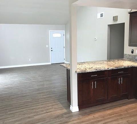 Beautifully remodeled 2 bedroom 2 bath. New laminate flooring throughout, all new kitchen cabinets, granite counter tops, appliances, fixtures. New vanities in bathroom. Vaulted ceilings in living room give the home lots of light and volume. Large slider from living room to large private patio area. Owner pays water