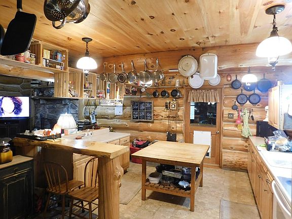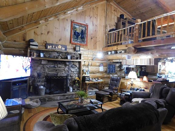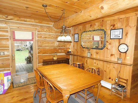 Custom built Hemlock log home on 2.48 private acres with wormy Oak floors on 1st floor and wormy Pine floors on 2nd. Stone fireplace & cathedral ceiling in living room, large family room on 2nd floor (open loft) . Wrap around porch, full basement and outbuildings.