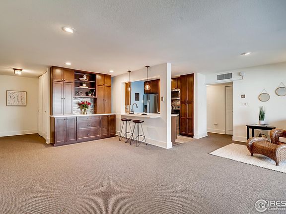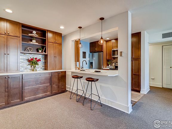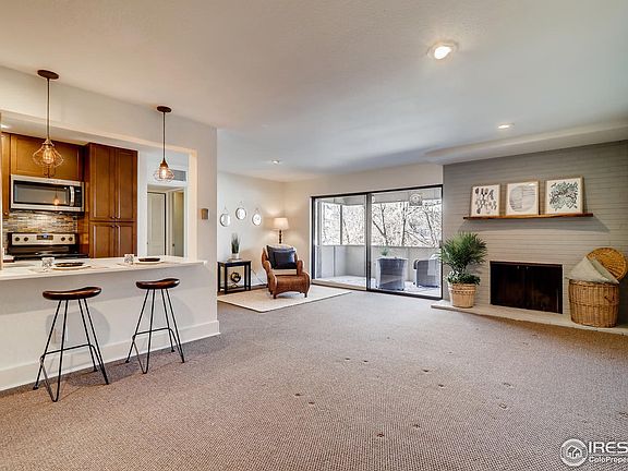 Fabulous condo in the heart of Boulder with awe-inspiring views of the Flatirons. Unique updates with an open concept kitchen unlike any other unit in the building! Decked out kitchen with new cabinets, solid surface counter top & appliances. Wonderful cabinet buffet for more storage. Warm fireplace to enjoy on those cold nights. Large master bedroom en-suite with two large closets, updated bath & new high end window with views of the Flatirons. Bright updated main bathroom. Spacious 2nd bedroom. Large Southwest facing balcony is awesome all year round! Ideal location blocks from CU campus, Google, walk-able to downtown, shops, coffee, restaurants. Assoc Fee includes heating, cooling, indoor pool, hot tub, pool room, rec room, library, and an assigned storage locker. 1 carport parking spot included!
