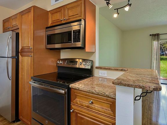 Renovated custom built kitchen with granite counters,wood cabinets,Pantry with pull outs, Stainless steel appliances with self clean oven and convection microwave. Kitchen window with views of pond. Beautiful laminate flooring throughout living area and bedrooms. Updated bathrooms with tile floors. Washer/dryer included for your convenience. Lots of natural Light and Open concept. Concrete built first floor end unit. Back patio with great views of the landscaped common area includes BBQ grill and access to the pool. Amenities include Pool, Gym and BBQ area. This is a great neighborhood with gated entry & lushly landscaped. Only 14 min. to the BEACH, 6 min.to GOLF course, Wickham Park and conveniently located near shops and restaurants. Available TODAY! BEST TO CALL NOW!