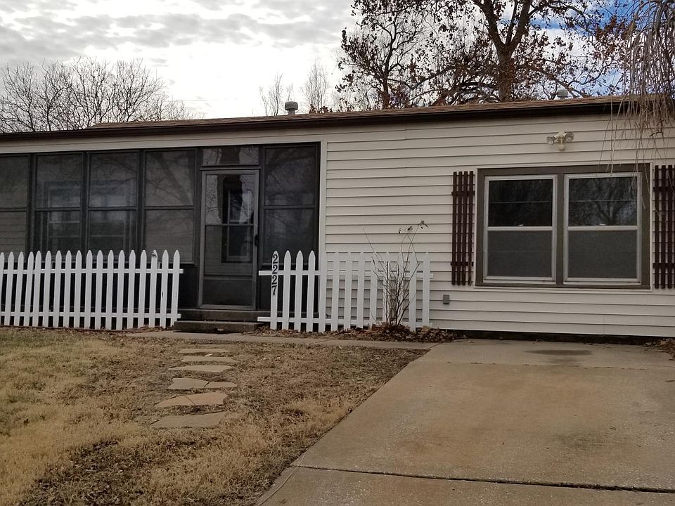 3 Bed/1 Bath home in SE Wichita. Home features screened in front porch, nice size living room, hardwood floors throughout, plenty of cabinet space, eat in kitchen, separate utility room w/ washer/dryer hookups, walk in closet, big back deck, good size fenced backyard, backyard shed, off street parking. Home rents for $750/month and $750 security deposit. Home is not set up for section 8. Pet policy: this home can handle up to 2 pets medium size or smaller, $10/pet/month for pet rent. Some breed restrictions apply. From Pawnee & Oliver, E to Ridgewood Dr, N to Old Manor Rd, NW to home. Home is located at 2227 N. Old Manor Rd. For more information or to schedule a showing, please visit us at www.jennicproperties.com.