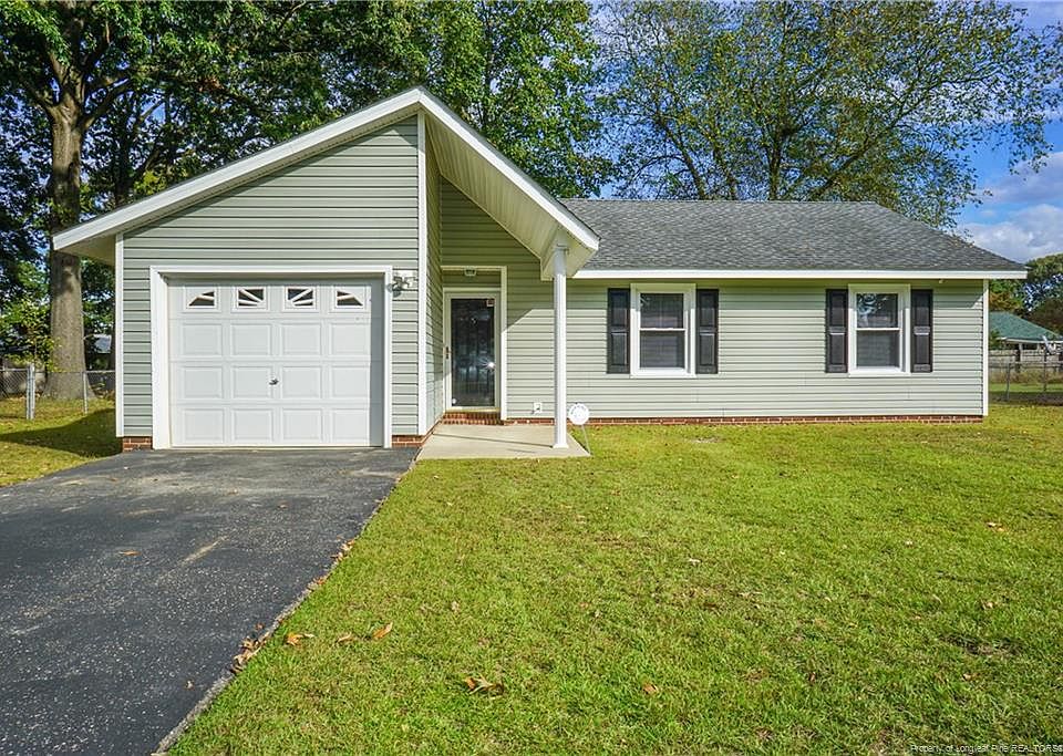 Honey Stop the Car! Updated Ranch home features Large Living /Dining Room, Updated Kitchen with Stainless Appliances, Laundry Closet with Washer and Dryer, 3 Bedrooms, 2 Full Baths, 1 Car Garage, Fenced Yard, Patio and Shed! Bathrooms have been updated. 30 year Architectural Shingles, Carpet in Living Room and Bedrooms, Tile Floors in the Kitchen, Baths and Dining areas. Walk in Linen Closet. Washer, Dryer and Refrigerator all remain as gifts for the buyer! Low maintenance vinyl siding. Everything is all on one level. No stairs! Located close to Shopping, Schools, Restaurants and within 20 minutes or less to Ft Bragg! Hurry this one will not last long. Roof was replaced in 2011, HVAC replaced is 2008, Hot water heater replaced in 2011,