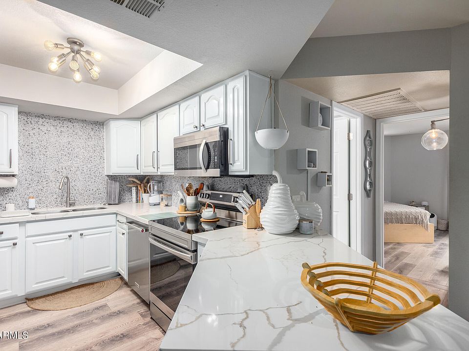 Truly stunning, fully remodeled condo in a gated, boutique community w/ample amenities! This meticulously maintained first floor unit is nestled in a prime location in the middle of the community w/courtyard facing covered patio accessible from living area & bedroom. Spacious floor plan w/tons of upgrades including high-end laminate wood flooring, quartz countertops, glass mosaic backsplash, stainless steel appliances, floor to ceiling tiled shower w/glass door, gorgeous vanity, updated light fixtures- All added in 2021! Inside laundry room w/extra storage. Covered carport. Central location just minutes from major freeways, Sky Harbor Airport, ASU, downtown Phoenix, Tempe & Scottsdale w/views of Papago Park from the front entrance. This one will not disappoint & won't last long! Common areas are an oasis in the grassy area between north & south buildings, featuring amenities such as a pool, spa, fitness center, & BBQ area. The HOA covers water/sewer/garbage collection, pest control, roof repair & replacement, exterior maintenance of the unit, common area maintenance, & a blanket insurance policy. This total remodel is the perfect investor opportunity or a wonderful place to call home. It shows perfect & is definitely a must see!