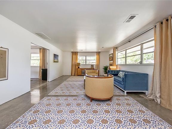 Gallery-style living in the heart of Belle Isle neighborhood: open spaces, modern elements with concrete floors, white walls waiting for your art collection, lush landscaping at every turn and views from inside the home, airy yet plentiful storage, plus great flow for entertaining that spills onto a side patio and backyard. Once a four-bedroom home, this space has been transformed into a double-sized primary suite and two additional bedrooms. The two bathrooms have been completely renovated with white finishes - one of the baths pops with color with a bold, fun wallpaper. The artistic color in this home is its personality. It can be neutralized in a flash if that's your style. Wrap-around corner lot with nurtured perennials and trees. We invite you to walk through and experience this mid-century modern home for yourself.