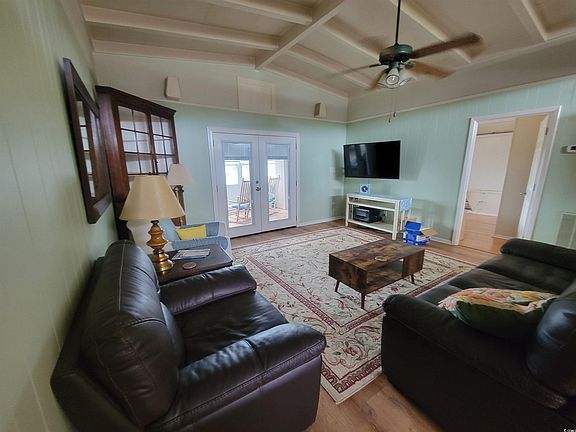 Welcome to your little piece of paradise with gorgeous sunsets. This raised beach bungalow is ready to be called home Or it can be placed on weekly rental. Located on a creek of the main channel that leads to deep waters. While entering the main house from the wrap around porch you will enter into the kitchen that has been completely renovated with butcher block counters, new cabinets and appliances. The open concept leads into the living area with cathedral beamed ceilings giving it extra charm. With 4 bedroom upstairs and 2 baths and Carolina room overlooking your personal dock. In addition there are 2 bedrooms 1 bath downstairs giving it a capacity to sleep 12 plus guests. A workshop is also attached. Plenty of parking and a short walk or golf cart ride to the sandy point of the beach. Comes furnished minus antiques and personal items.