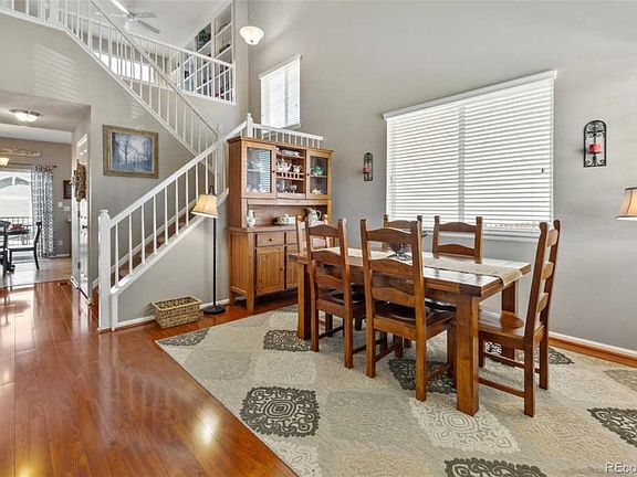 Beautiful, light, bright and conveniently located home in The Bluffs at Saddle Rock Ridge neighborhood! This home boasts of vaulted ceilings and a flex room that can be used as living or dining room. The family room has a gas fireplace and built-in shelving that is open to the kitchen with an eating area, pantry and all stainless appliances included. Walk out the slider door to enjoy the oversized trex deck to enjoy the open space/views from this home! The upstairs has a master bedroom with walk-in closet and private bathroom, 2nd bedroom, full bath, laundry and a loft with built-in shelving that can be converted to a 3rd bedroom. The walk-out basement is fully finished with a recreation room, flex room and 3/4 bath with beautiful vinyl plank flooring. This home has a brand new furnace and a/c (Jan 2021), newer hot water heater and concrete in the driveway and garage. Located with extraordinary convenience to desirable Cherry Creek Schools, parks, playground, shopping at Southlands Mall, restaurants and airport!