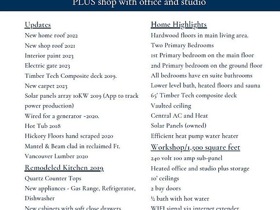 This home and property offer a serene & picturesque country setting, perfect for a peaceful lifestyle. Enjoy its pastoral surroundings & the convenience of shopping only 5 miles away. One of the highlights of this home is that is flooded with natural light from the wall of windows. The living space flows out to the covered back deck, which provides a wonderful spot to enjoy stunning sunsets throughout the year. Additionally, you can relax and unwind in the hot tub or sauna. This home has undergone beautiful updates, including a new kitchen, wood floors and 65 ft composite deck. The owned solar panel array can provide a savings of up to 70% of your annual electrical costs. It is also generator ready, providing a backup power solution during outages. Pursue your dreams in the spacious 1500 SQFT shop, complete with 10-foot ceilings. This versatile space offers endless possibilities with the attached studio & office. The potting shed, garden, and fruit trees add to this sanctuary. Your gardening and cooking skills can blossom, along with the joy and fulfillment that only a garden can provide.