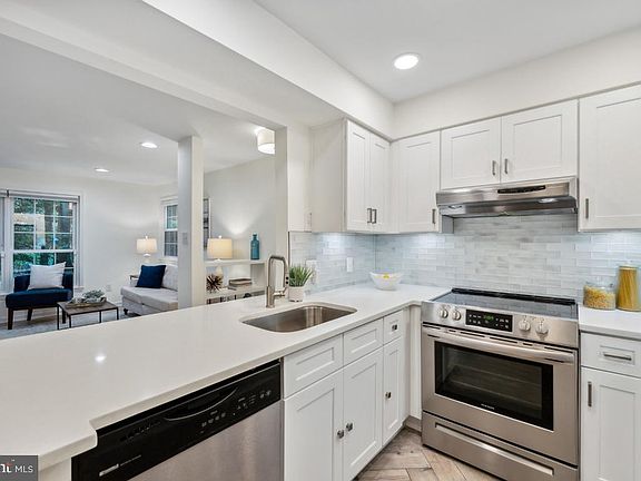 Backing to Reston's wooded trails this recently renovated, 927 sqft, ground-level, 2-bedroom, 1-bathroom unit welcomes you in Reston's Bristol House community. Renovations include a beautiful kitchen featuring quartz counters, white shaker cabinets, beautiful tile backsplash, and black matte hardware. Enjoy all stainless steel appliances (refrigerator 2020). The kitchen is open to the dining area which features a beautiful modern chandelier. A wall of windows allows you to enjoy the outside nature while staying cozy by your electric fireplace with modern tile hearth. Renovated in 2020, the dual entry bathroom features a lovely quartz top vanity, stylish mirrors and lighting, and a beautiful shower/tub (new 2019) combo with tiled surround and a convenient shelf and niche. Brushed white oak engineered wood flooring run throughout the entire unit. Continue to enjoy your place in nature in each bedroom which both have sliders to the exterior patio. The primary bedroom enjoys a private entry to the bathroom, a private quartz top vanity, and walk-in closet with Elfa organizer system. The second bedroom is perfect as a bedroom, nursery, den, or office. Additional unit amenities include the in-unit washer and dryer (2020), dual pane vinyl windows, and additional storage in the patio closet. There is one assigned parking space (#57) and plenty of unassigned spots. As the newest resident of Reston you can enjoy all the fabulous Reston Association amenities: miles of trails, all the pools, volleyball, tennis courts, and more! Easy access to the Dulles Toll Rd and new Metro Silver Line, Wegmans, Reston Town Center. Pack your bags! This is it.