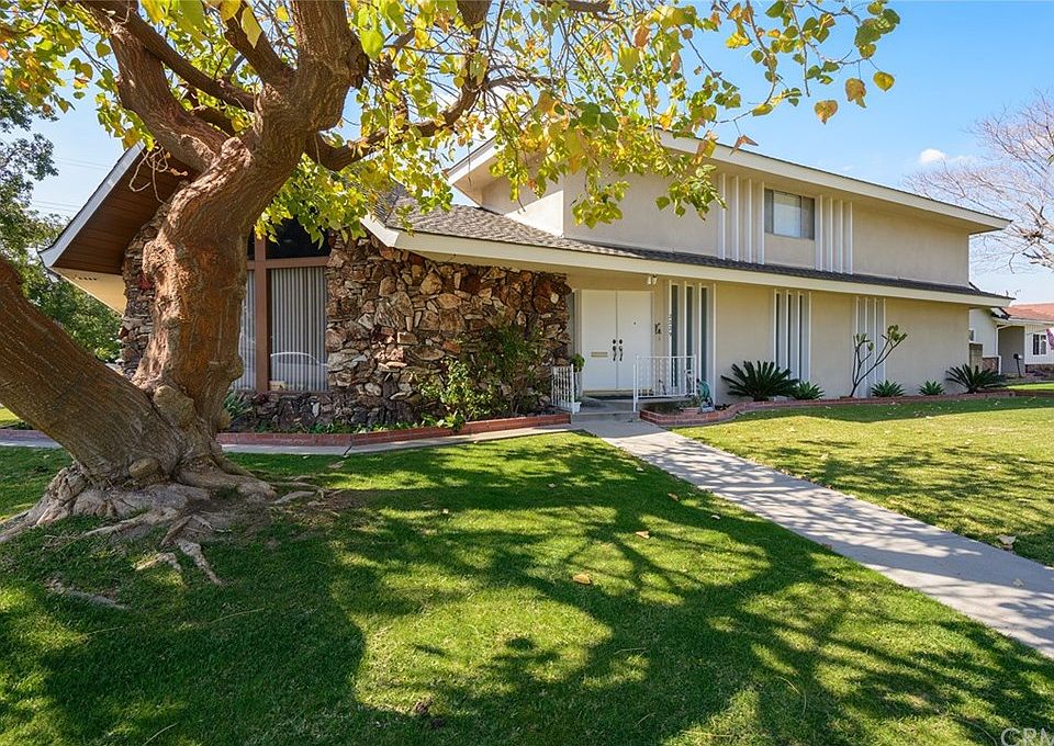This custom built home sits on a sprawling corner lot in a desirable neighborhood of Anaheim very close to Disneyland. Designed perfectly with both family and entertaining in mind, the spacious and unique floor plan sets this home apart from the average! Pride of Ownership is found in the details and extras that it offers including, marble flooring with a custom floor heating system in kitchen and family room, water softener, step down living with fireplace, Large master bedroom with slider doors leading to pool area, sunkin tub/separate shower in master bath all found on the lower main level of the home, large family room with wood cathedral ceilings joining the expansive island style kitchen with newer cabinets and swirl granite counter tops. Additional bedrooms upstairs with large bath and dual sinks,. Entertaining backyard with lush landscaping, grass area, and nicely done hard scape around the pool with fire pit