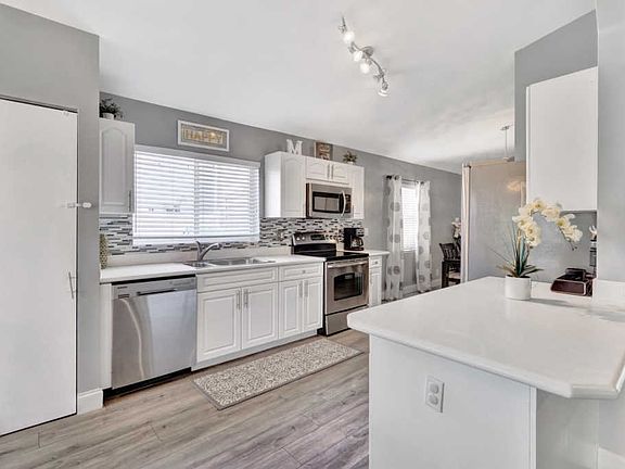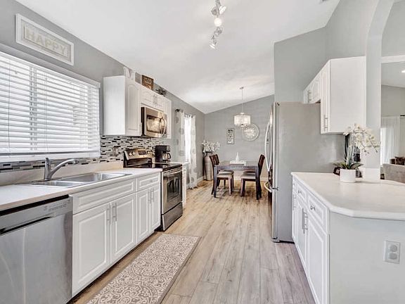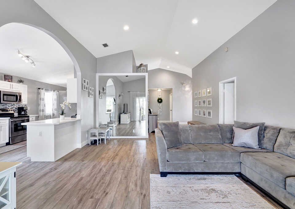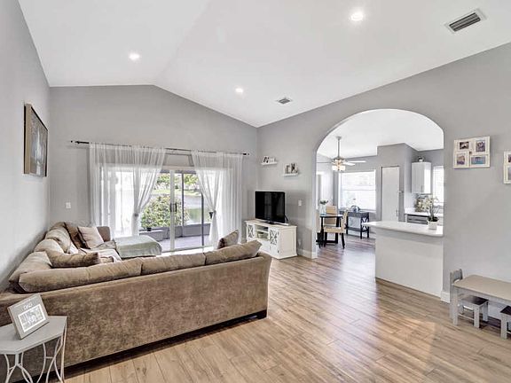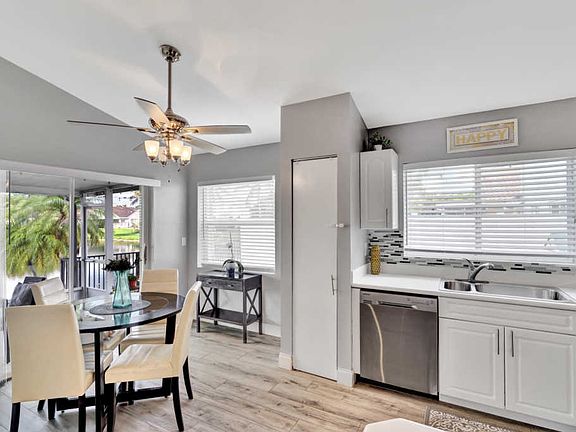 Spectacular lake front home that has been renovated and is move in ready. You will fall in love with the open concept layout featuring vaulted ceilings and split bedrooms floorpan. Large covered screened in patio offering stunning sunset views from every room across the back of the house. Modern updated bathrooms, waterproof & scratch resisted vinyl flooring throughout, beautiful white kitchen with newer appliances. Custom built in closets,Recessed lighting, accordion shutters, artificial turf making the yard ideal for children and pets! Huge bonus 4th bedroom originally garage converted by the builder with plenty of storage area. Newer AC, water heater & roof.Conveniently located next to the community pool & playground. CALL LA AGENT FOR APPOINTMENT. NO SHOWINGS UNTIL FRIDAY BY APPT ONLY