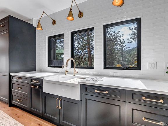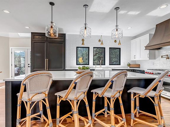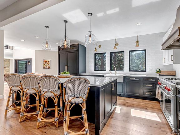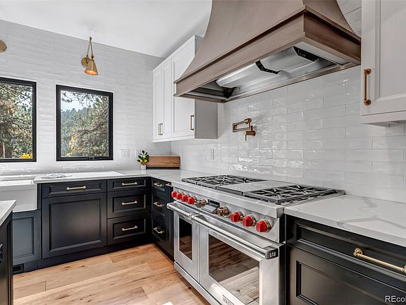 Nestled within the prestigious Riva Chase gated foothills community, just 20 minutes from Denver, this stunning home epitomizes luxurious living. Showcasing three levels with five bedrooms and four bathrooms, the word “spacious” does not give enough justice to the vastness and open feeling of this estate. Accentuated by abundant natural light streaming through numerous picture windows, an 8-foot bi-folding door, and vaulted ceilings, you are able to bring the mountains indoors to create your true mountain retreat. The updated kitchen is a master chef's dream, showcasing quartz countertops, a subway tile backsplash, a Wolf cooking range, pot filler and hood, a trough porcelain sink, a Sub-Zero refrigerator and freezer, a plumbed-in Miele espresso machine, a wine tower, custom ice maker, and ASKO dishwasher, all flawlessly brought together by Thurston Kitchen and Bath custom cabinetry. Step outside your kitchen to enjoy your indoor/outdoor eating lifestyle and revel in the beautiful wooded views from the extra-large southern-facing Fiberon deck. The main level includes formal living and dining areas with newly installed marble mosaic tile over the fireplace, a wood block mantel, and a study with French doors, perfect for a home office. Upon entering your double-door entryway, you are captivated by your hickory wood flooring with an antique pecan stain and Knotty pine doors, stair railing, and posts. The master retreat features a fireplace and a newly remodeled ensuite bath with a zero-entry shower and slope. You will also enjoy two additional bedrooms upstairs that connect to an updated shared bath with dual sinks. New windows have been installed throughout the home by Renewal by Anderson. The lower walk-out level is perfect for entertaining with two bedrooms, a newly built custom bar with a dishwasher, beverage fridge and kegerator, a bathroom, and an oversized family room. Other amenities include a Bullfrog hot tub, basketball hoop, and a community playground.