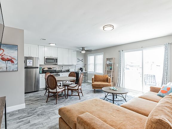 Welcome to your perfect shore retreat! This second-floor renovated condo, just two properties off the beach and steps from the seawall offers two bedrooms, one full bath, a large private balcony with lovely ocean views.. The bright, airy, open-concept layout features new windows and tile flooring. The updated kitchen offers granite countertops, incorporating modern appliances and lighting with a stylish backsplash. Lovely tile baths with contemporary finishes. Freshly painted and redecorated with new furnishings throughout. The exterior is finished with fresh new siding and landscaping, a newly blacktopped driveway with one assigned off-street, parking spot. The spacious balcony is perfect for relaxing and gazing at the ocean or people watching on the famous seawall. The expansive rear yard, which serves as a common area, is perfect for sunbathing and gatherings, and you can even add a private shed for extra storage for your beach toys. Enjoy modern amenities and coastal charm in this beautifully updated condo, ready for you to move in and enjoy the beach life. TAXES AND ASSESSMENT TO BE DETERMINED. TAXES ANDASSESSMENT TO BE BASED ON SALE PRICE.