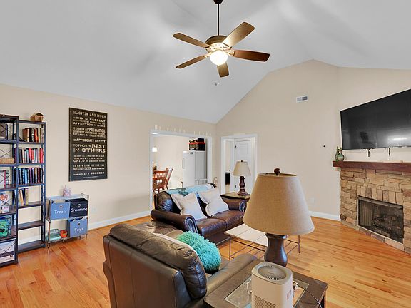 Cozy gas fireplaceCovered front porchAmple cabinet storageInviting open-concept layoutVaulted ceilingsCrown moldingGranite countertops