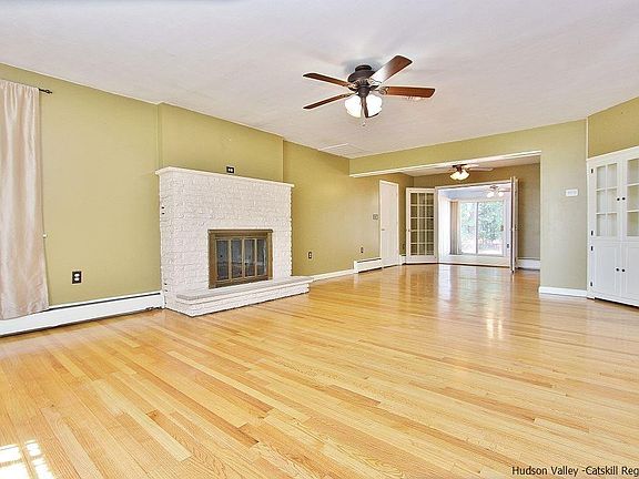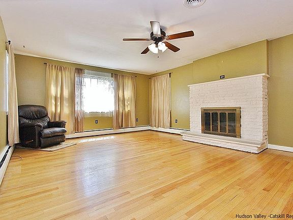Sprawling ranch home is located on a quiet dead end street and just minutes to Kingston Thruway exit 19, the bus station and historic Uptown Kingston. Step inside to all oak hard wood floors throughout most of the home. The huge living room features a bold brick fireplace and leads out to the dining room, then French doors to the Florida sun-room, home has great natural light. The kitchen is really open and airy, this room is combined with the den and a wall of windows facing the back deck and private back yard. There are 3 bedrooms in the home with a full bath and half bath in the hall. Lots of closet space in all the bedrooms along with plenty of storage in the pull down attic. The lower level is partially finished, there is a mostly finished room with a fireplace and then the rest of the basement is just great storage and workshop space. At one time there appears to be a waterproofing basement system but not sure about the history or brand. The heating system is in good working condition along with an updated 200 amp service and a hookup for a generator. Updates include a new roof in the past +/- 10 yeas, new leach field in the last +/- 2 years and an updated boiler in the last +/- 10 years. The garage is an over-sized 2-car wtih a loft area for storage. Residence is located less than 5 minutes to NYS Thruway Exit 19 Kingston and Historic Uptown Kingston, also about 10 minutes from Woodstock, the Village of Saugerties, Rhinebeck and Ulster Counties major shopping district. Home and grounds show very well this is a must see.