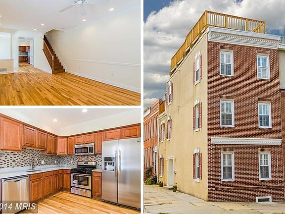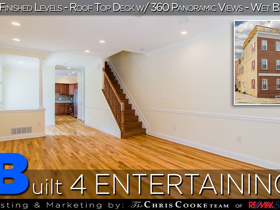 BUILT FOR ENTERTAINING! SPACIOUS END OF GROUP ROWHOME W/ 4 FINISHED LEVELS & ROOFTOP DECK W/ SWEEPING VIEWS! Hw floors on main level, LR w/ crown molding, Chef's kit w/ granite counters, ss appliances, & tile backsplash, 2nd lvl w/ 2 beds, dual entry bath w/ sep tub & sep shower, 3rd level bed & party room w/ wet bar, fin basement w/ FR or 4th bed & full bath, rooftop deck w/ amazing city views!