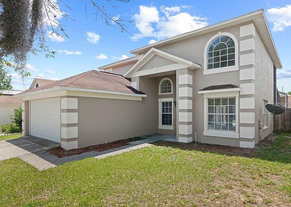 Welcome to this comfortable 2 story 5 bedroom, 2 1/2 bath pool home located in the Davenport Lakes Community. As you approach the home notice the fairly newer exterior paint (3yrs) with solar lights, plants and an accent front door. Enter in and to the left is the family room with comfortable seating. This room can be converted into a private dining area. To the right of the home is the open space living area with vault ceilings upgraded ceiling fans, luxury laminate flooring and large windows for natural light. Continue into the kitchen seating area with a high breakfast bar separating the full kitchen along with a separate laundry room leading to the two-car garage. There is also a downstairs half bath for guest. This home features a downstairs primary bedroom large enough for a king bed. The primary bath has a separate shower and garden tub. The bedroom and living room has sliding doors which lead directly to the large L-shape fenced-in lanai area. Another place to sit and relax. The upstairs offers 4 bedrooms with a full hall bath and a loft which overlooks the living area. Great for office or entertainment room. Come and see this home, it is priced to sell. The roof is in the process of being installed and the pool needs resurfacing. The HOA is fairly low and the community has a pool, grilling area, tennis court, direct boat slip and dock to Old Lake Davenport. The community is also conveniently located near Central Florida attractions, major highways and minutes from shopping, dining, supermarkets, souvenir shops, golf courses, good schools and much more. Make an appointment today!