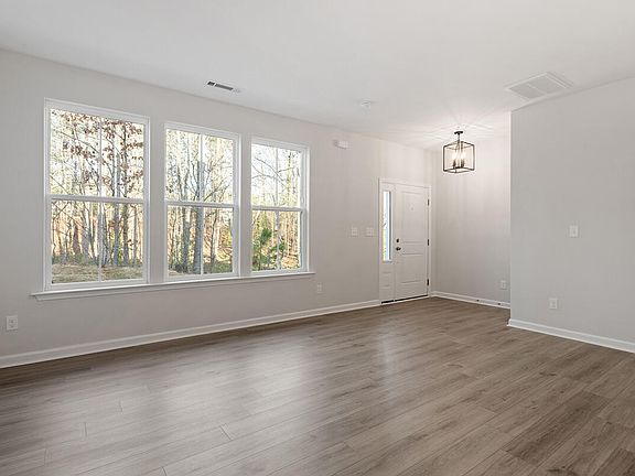 Check out this spacious two-story townhome with a two-car garage, just a quick 15-minute drive from downtown Raleigh. When you come in from the garage, you'll notice a little pet pad for your furry friend. The hardwood stairs and sleek metal railings add a nice touch of style. Upstairs, the family room flows right into the eat-in kitchen, which comes with chic white cabinets and beautiful white quartz countertops. The interior colors give it a bright, open vibe—perfect for hanging out and entertaining. The second floor has a primary suite that features dual closets, dual sinks, and a handy 5-foot tile shower. Plus, there are two more bedrooms that share a bathroom nearby, so everyone has their privacy. This townhome isn't just about comfort; it also offers some cool amenities like two dog parks, a pool, and walking trails that really make it stand out. Don't miss your chance to check it out!