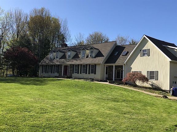 Large Home surrounded by woods on 7.02 acres with a pond and a large 40'x25' metal pole barn. 4 spacious Bedrooms and 3 full baths. Large unfinished bonus room above garage. New Heating system only 3 years old. Propane Boiler hot water base board heat as well as a pellet stove in the family room. has a well and septic.