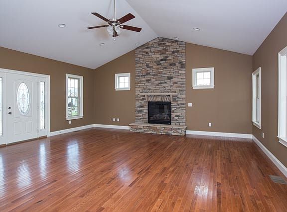 Antique white cabinets with chocolate glaze and Brazilian granite, stainless appliances, center island and breakfast bar complete the kitchen. Oak hardwood throughout main level. Large great room, stone gas fireplace and vaulted ceiling. 3 bedrooms, 2 baths on second level, laundry second level with bedrooms, 8x22 covered back porch, 6x22 covered front porch, home wired for video and audio distribution. Fenced back yard, inground pool, stamped concrete back patio.