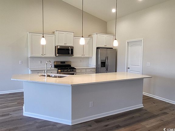 Golf cart to the beach from this beautiful Edisto floor plan on a large lot, almost completed and ready for you, by the local builder voted Best of the Grand Strand for the second consecutive year! In the Ocean Palms community (Voted Best Neighborhood!), and scheduled to be complete in late March. This terrific open floor plan home has wood-look LVP flooring throughout - no carpet! Stainless appliances, staggered-height Shaker-style white cabinetry, quartz counters, white subway tile backsplash, a walk in pantry and a huge work island/breakfast bar combine to give the kitchen the wow factor you're looking for, while the recessed and pendant lighting plus the bay windows in the dining area and glass sliding door flood the home with light. The sliders lead to a large screened porch and a patio, overlooking the backyard, which is large enough to install a pool, if you wish to. The spacious owner's retreat features a tray ceiling, walk in shower, long quartz vanity with double sinks, plenty of storage in the cabinetry and linen closet, plus a huge walk-in closet. Two additional bedrooms and a full bath with quartz counter are tucked off on their own private hallway, for privacy. All of the homes in Ocean Palms come standard with the luxury of natural gas (tankless water heater, gas heat, and gas range). The garage is completely trimmed and painted, with floored attic space accessed by drop-down stairs, and the front and back yards are fully sodded. Ocean Palms is conveniently located near shopping, restaurants , schools and world class medical offices and hospitals, and is only a short golf cart ride to Surfside Beach's gorgeous beach and the Atlantic Ocean. Other floor plans and inventory homes may be available. Community Pool and Cabana, too!
