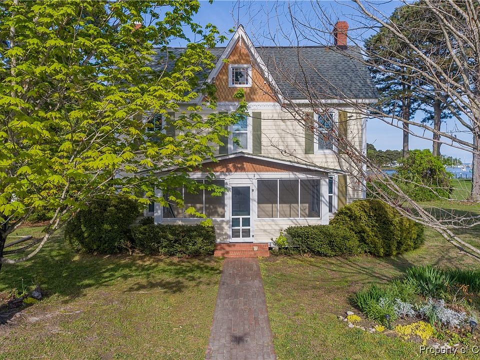 Nestled on the iconic Lovers Lane in Deltaville, this enchanting 1920s storybook farmhouse offers timeless character with splendid woodwork and rich period details throughout. Set on a full acre of nicely landscaped grounds, the home features 3 spacious bedrooms, 2 baths, and a large, inviting living room with a cozy fireplace. The elegant dining room—complete with a sparkling crystal chandelier—can also serve as a delightful parlor or additional sitting room.