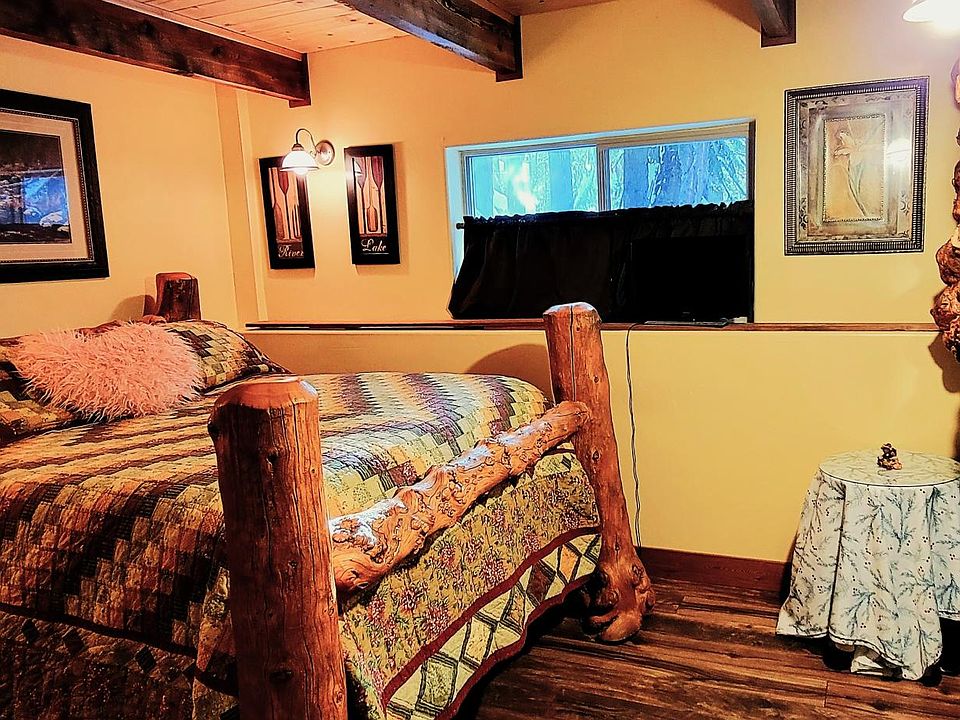 Big Mountain Cedar CABIN and CHALET: This is a 3-level house built on a mountainside among large cedars and is divided into two separate, self-contained and private units: 1) This furnished rental is referred to as the "CABIN" and is this ground-level, walk-out daylight basement and includes queen bedroom, living/dining room, supplied kitchenette, full bath with 2 sinks, common area with two drop-down tables, private entrance with separate access, and private parking spot. This Cabin has access to the front porch. 2) The upper two levels are referred to as the "CHALET" and include the middle and 3rd levels of this mountain house and is occupied by the caretaker, owner, or visitors. Located in a private resort community with shared onsite amenities such as indoor pool, outdoor hot pool, private beach on Whitefish Lake, and more. If interested, send a message describing yourself, what you'll be doing during the rental period, how many in group [remember the rates start with solo renters, then additional rate per person thereafter with no more than three individuals max], how many vehicles, for how long, etc. RATE is for one solo renter. Additional renter adds $50/mth. PARKING: One vehicle permitted.in specific parking space in front of the entrance. No RVs, trailers, boats, etc. STORAGE: All you need is a suitcase as storage is limited to three closets. Absolutely nothing can be stored outside. RENT includes everything except 40% electric to be deducted from consecutive months with the final deduction coming out of the deposit. DEPOSIT is refundable within 30 days of departure, less electric share, any damage, and not following departure terms. DEPARTURE TERMS: Leave as found, clean anything used in the kitchenette and leave to dry, strip bedding and place with towels in basket provided, remove all trash, place anything moved to original location. QUIET TIME 10:00 p.m.: This private resort community has its own Rules and Regulations, and one of them is maintaining a quiet environment. NO PETS - NO CIGARETTE SMOKING - NO PARTIES - NO EXCEPTIONS ONSITE AMENITIES: Aquatics Facility one mile away with indoor pool, sauna, locker rooms, outdoor hot pool, bbq, picnic area, tennis. Also access to private beach with day dock on Whitefish Lake. APPLICATION: If interested and you qualify, message us with more information about yourself, how long, how many, etc., then an application will be sent if qualified.
