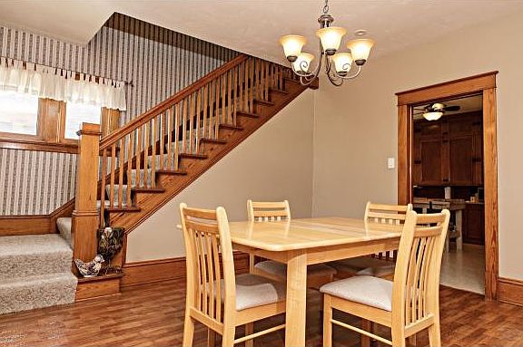 Updated character home w/Craftsman style open staircase, orig. woodwork & colonnades, piano windows & formal dining w/built-ins w/leaded glass doors. 1st fl master & 3 upstairs bedrooms with large closets. Bonus room can be used as closet, office, or playroom. Newly remodeled main bathroom. Full bathroom & laundry hook-ups & storage in basement. 24x28 garage + 8x10 shed & 8x18 carport per seller. Paved firepit area & swingset.