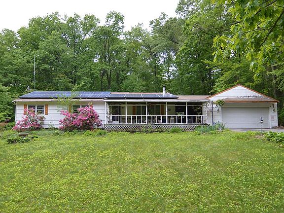 Great location and potential in this "Fixer-Upper" being sold "As-Is, As Seen" ...Spacious Living Room with wood stove is open to Eat-In Kitchen. Master boasts en suite half bath and walk-in closet with exterior access for potential private deck overlooking Koi ponds. Two additional good size bedrooms and Full Bathroom. Full Basement with potential to finish for additional living space. Outdoor Living includes front covered porch, side private porch and over an acre to finish to suite your needs! Your design ideas will go a long way to bring this home to it's full potential!!