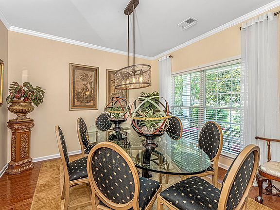 Beautiful and move in ready home on Mayfield Drive has 4 bedrooms and 2.5 bathrooms and 2588 sq ft. The master suite is located downstairs and is tucked away from the living space for peace and tranquillity. The beauty of Tuscany colors, soothing, calming, will envelope you upon entering this home. This home can entertain dozens with its wide range of socializing areas: dining room, flex space, eat-in kitchen, open concept kitchen and family room, sunroom/morning room. The family room has majestic tall ceilings, custom built in shelves with LED lighting, crown moldings throughout the home with ambient lighting adds so much value. The natural light flows through the home but with the mature landscaping adds privacy. The kitchen has a walk in pantry, new appliances, new granite and subway tile backsplash. Separate dining area features seating for 8-10 guests. Flex space off entry with glass French doors is functional and bright. The master bedroom is located on the main floor and has a tray ceiling, custom colors, new carpet and custom closet system. New commodes were put in master bath and powder room in 2021. New HVAC unit was installed in 2020 and hot water heater was 2022. Window coverings for privacy and drapery with custom rods will convey with the house. New cordless soft shades for the family room, kitchen and morning room with plantation blinds in the rest of the home allow for privacy when needed. A new garage door opener was added. The backyard has a privacy fence and is large and ready for friends and family. The patio retreat has a motorized awning to shade and adds ambiance to the custom outdoor patio. Premium landscaping surrounds this home allowing beauty and privacy at once. This home has it all beauty, functionality and location! Brickhope Plantation is located in the heart of Goose Creek, minutes from restaurants, shopping, the Navy base and so much more. Brickhope Plantation amenities include a pool, clubhouse, gym, playground and open grassy area with friends and family.