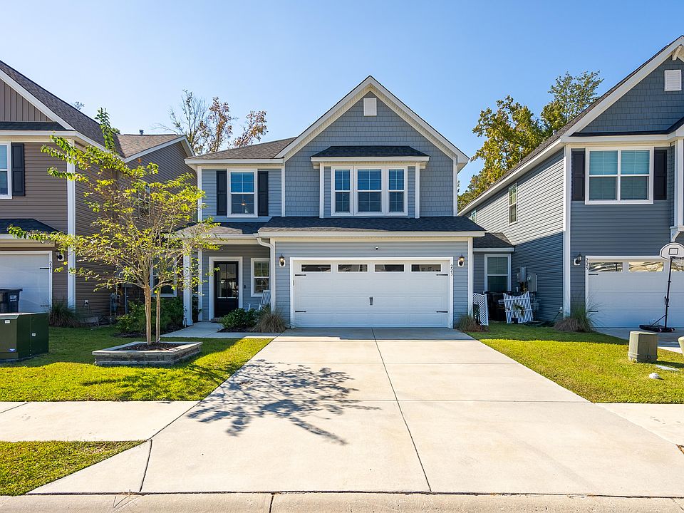 Welcome to 223 McClellan Way, a lovingly maintained three bedroom home in Hampton Woods, only 5 miles away from downtown Summerville. This home is move-in ready and sure to please.Upon entering you are greeted by the large entry foyer finished with shiplap wall accents and beautiful LVL flooring. Down the hall conveniently located to the right is the powder room, laundry area, and drop zone off the garage door. The well-appointed kitchen hosts loads of cabinetry and storage, granite countertops, stylish backsplash, breakfast bar, gas range, fridge, and a pantry. Just past the kitchen is a dining area and large living room with backyard views. The spacious main level owners suite offers a tray ceiling, upgraded fan, and luxurious ensuite bathroom complete with a soaking tub, shower, dual vanities, and large walk in closet. Upstairs you will find a large landing area that has a variety of uses. A second living area, entertainment center, home office, or play area all come to mind. Two additional bedrooms are of ample size with ceiling fans and share a Jack and Jill bathroom. The backyard is perfect for grilling out or relaxing on the patio. Additional storage is located at the back of the home on the right-hand side. Hampton Woods HOA maintains the lawn and common areas. The outside storage shed shares one common wall with the neighboring home. Hampton Woods neighborhood is convenient to downtown Summerville, shopping and dining in Nexton, and I26.