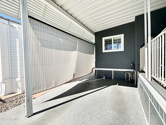 ELEGANCE AT IT'S FINEST! INCREDIBLE RESORT LOCATION, SOUTH FACING & just a few steps to our IMMENSE RECREATION CENTER! FABULOUS CURB APPEAL boasting an EXPANSIVE TILED DECK for outdoor LIVING! ROLL DOWN SUN SHADES adds privacy. GRAND outdoor sectional is perfect for entertaining & taking in the AZ weather! FRESH EXTERIOR PAINT w/ STONE BOARD SIDING, DECORATIVE COATED carport adds an inviting touch! You will FALL IN LOVE as you step into this METICULOULY MAINTAINED home offering a FRONT KITCHEN, WELL DESIGNED AZ ROOM FLOOR PLAN w/ 1 bed, 1.75 bath w/ an additional BACK ROOM ideal for EXTRA STORAGE or GREAT for a hobby area w/ BACK door to the SPACIOUS back patio! LOADS OF CABINETRY, DREAM kitchen w/ TONS of COUNTER AREA for all your entertaining & cooking needs! FULL SIZE STOVE, DISHWASHER & RO drinking water! WRAP around cabinets off dining area adds more storage room & makes for a great display area! LOVELY TILED FLOORING & REAL HARD WOOD FLOORING IN AZ ROOM makes this one absolutely GORGEOUS! WHITE SHUTTERS IN AZ ROOM & 2 inch WOOD LOOK BLINDS! DESIGNER INTERIOR COLORS THROUGH OUT. CHARMING BEDROOM offering a large mirrored closet & BUILT IN DRESSER AREA! An ABUNDANCE of bathroom space in both with LARGE WALK IN SHOWERS along w/ HIGH END VANITIES! CHARMING TOUCHES throughout this DELIGHTFUL HOME! LIGHT & BRIGHT W/ LOTS OF NATURAL LIGHT! CEILING FANS, TWO SECURITY SCREEN DOORS great to let the breeze in. PERFECT FOR ALL YOUR GUESTS TO VISIT! A LOAD OF indoor & outdoor area to ENTERTAIN! SO MANY AMAZING UPGRADES ON THIS HOME! NEW A/C UNIT & NEW ROOF within the last 2 years! COME ENJOY THIS GATED HEAVENLY 55+ RESORT offering 2 pools, an array of activities to participate in AND all kinds of fun to be had! DON'T MISS LOOKING AT THIS BEAUTIFUL HOME. OWN THE LAND.....YOURS TO ENJOY!