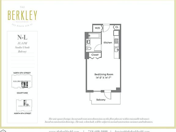 Top floor studio with western exposure, two closets and private outdoor space! Great afternoon sunlight and direct views of the Williamsburg Bridge and lower Manhattan! 1 month Free on a 12 month lease; 2 months free on a 24 month lease Available Immediately The Berkley was classically designed to reflect its industrial roots. Complimentary towers, connected by a central landscaped courtyard, The Berkley is one and half blocks from the Bedford L train, in the heart of Williamsburg, which continues to be the epicenter of the creative, artistic and entrepreneurial renaissance of New York City. This unit provides private balcony. Amenities: Staffed lobby lounge Rooftop sun-deck lounge with barbecue stations and showers Two story fitness center Courtyard with fire pit and yoga lawn Living Areas: Original Building Details Wide Plank Black Walnut Floors Custom Roller Shades Abundant Closet Space Bosch Washer and Dryer Private Balcony Kitchen Features: Bosch Fullsize Dishwasher Fisher & Paykel Fridge with Ice Maker Gray Slate Countertops Two Toned Cabinets Ample Countertop and Storage Space Bathroom Features: Toto Fixtures Caesarstone Countertops Miton Vanity with Storage Deep Soaking Tubs Glass Panel Shower Enclosure