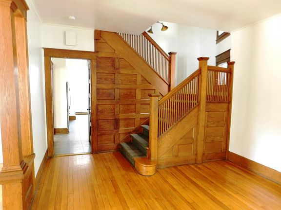 Convenience & Charm downtown Ithaca - only 3 blocks to Ithaca Commons and across from BJM Elementary. Craftsman details with abundant natural woodwork including a gorgeous mission-style entry staircase. Warm chestnut wood pillars between entry and living room, decorative fireplace in formal dining room. Hardwood floors in most rooms including the open living/dining. Large functional kitchen with tall ceilings and easy access to garage/off-street parking area. Main level 1/2 bath with laundry, plus mudroom. 2nd floor has 3 large bedrooms plus a dressing room/closet and oversized, bright full bath with tons of storage/closets. 3rd floor walk-up attic has 2 more bedrooms and storage closet. Striking Queen Anne window facing West. Screened-in front porch adds space in 3 seasons. Full basement is unfinished for storage/mechanicals. Bonus: seller replacing the roof prior to your purchase! Live in the heart of the City of Ithaca in Washington Park neighborhood. 1 block to Alex Haley pool!