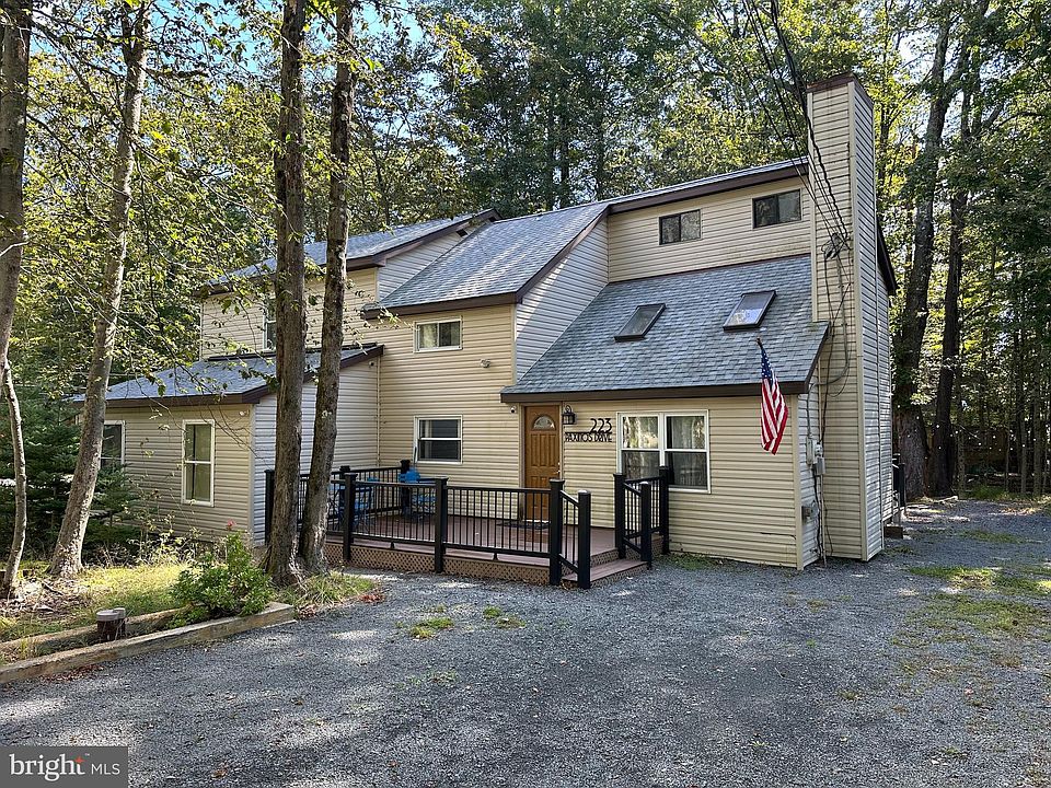 Welcome to 223 Paxinos Drive, a charming and cozy retreat nestled in the heart of Pocono Lake, PA. This gorgeous 5 bedroom, 3 bath home offers the perfect blend of rustic charm and modern comfort, making it an ideal getaway or year-round residence. Featuring a warm and inviting living space with a beautiful stone fireplace, perfect for chilly mountain evenings, and a spacious, open-concept layout that’s great for entertaining. The primary level of living contains two living room areas, as well as a spacious dining room, and an updated kitchen that is complete with crisp white cabinetry, granite countertops, and stainless steel appliances. There are several access points to the back deck of the home throughout this level, allowing you to blend indoor and outdoor living with ease. On the main level you will also find two spacious bedrooms and a full bath. Garage access can be found on this floor and also holds the laundry area. Upstairs, on the second floor, you will find three additional bedrooms with ample square footage and storage, as well as two full baths. The beauty in the home extends to the outdoor area, where the home is surrounded by lush trees, providing a peaceful and private atmosphere. Enjoy the serene beauty of nature from the expansive deck, by the fire pit, or take advantage of the nearby community amenities, including lakes, pools, beaches, and recreational facilities such as tennis courts and playgrounds. Whether you're looking for a peaceful retreat, short term rental property with all the furnishings, this Arrowhead Lakes home offers the best of both worlds.