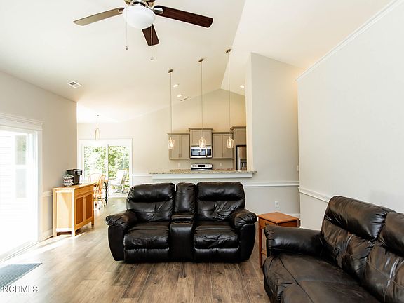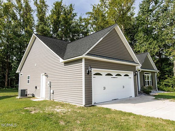 Built by Scheper Custom Homes this 1613 sq. ft. home offers an open concept. All on one level. Large living room featuring a fireplace, this opens to the kitchen with a bar and dining area. The kitchen showcases granite counter tops, stainless steel appliances and pantry closet. Split floor plan, primary suite has walk in closet dual vanity with a shower/tub combo and a separate shower. Separate laundry room leading into the 2 car garage. Two large guest bedrooms. One bedroom has cathedral ceilings. Outside you will love the 1.13 acreage with privacy in the backyard, wrap around deck in the back with 3 easy access sliding glass doors, gutters all around the home. Located at the end of a cul-de-sac. No HOA. Pecan Ridge is known to be a great neighborhood in Brices Creek area. Easy access to New Bern and Jacksonville.