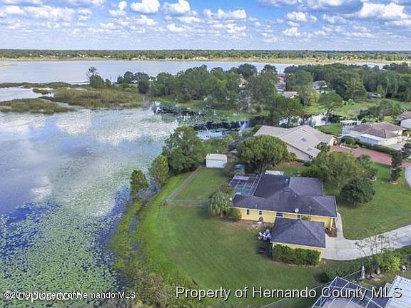 Lovely home on Hunter's Lake with 198' water frontage situated on a 1/2 acre lot. 4 bedrooms, 2 bathrooms, office, and a detached, 2 car garage. The eat in kitchen is open to a family room overlooking the private backyard. Enjoy the outdoors in the spacious lanai & relax in the inground pool. This home also features a 2010 remodeled kitchen with solid wood cabinetry & granite counter tops. Move in condition & very well maintained. Detached garage built in 2007.