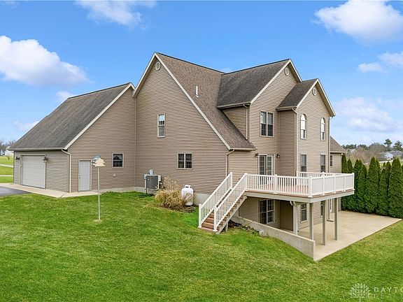Well-suited for refined living, growing households or multigenerational needs is lovely two-story beauty! Situated on a 2 A. lot & offers approx. 3800 SF, including a maintenance-free composite deck, inviting front porch & lower-level patio overlooking the scenic setting. Interior opens to a grand entry foyer w/open staircase, flanked by a private office or 4th BR, formal DR, 1st level primary suite provides a true retreat w/his & hers closets, double vanities (one being a makeup vanity), jetted tub, & sep. shower. A dramatic 2-sty great room features gas FP w/new gas logs, while the spacious eat-in kitchen offers island, quartz countertops, maple cabinetry & pantry. A 1/2 bath & laundry room complete the full BA. Walkout lower level is ideal for entertaining & extended living, featuring OSU-themed rec room & family room, full BA & abundant unfinished space ready for future customization. Completing prop. is a side-entry oversized 2-car gar.