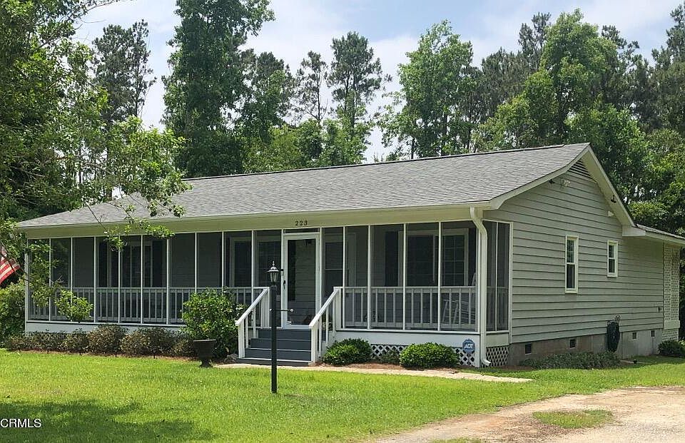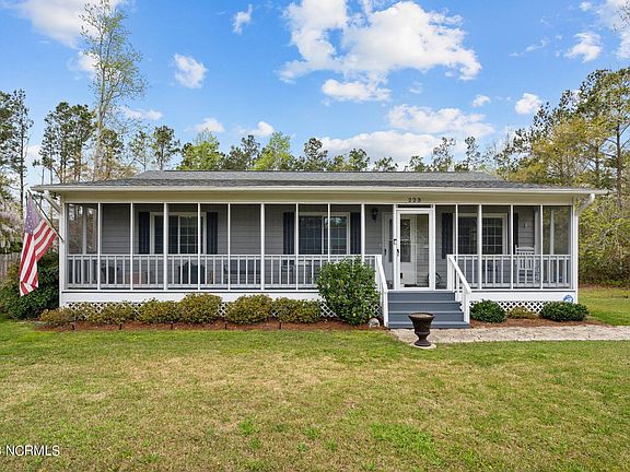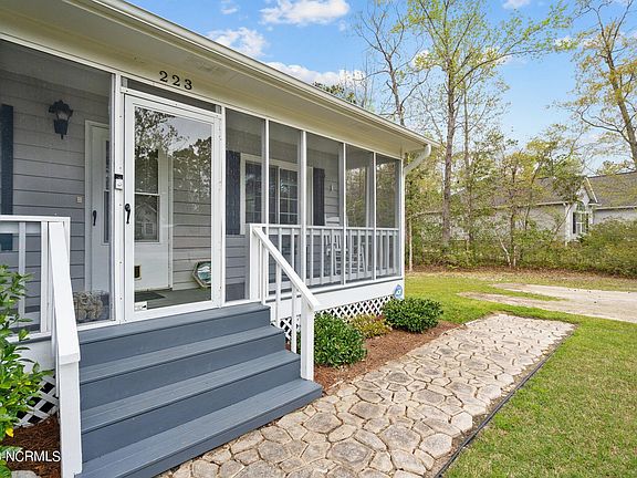 Location Location!! Deeded Water Rights. Private neighborhood pier to park your boat without having to remove it everyday. Huge amenity to walk to the water, or take the boat out without the daily hassle of removing it. 223 Sand Dollar Ln welcomes you with three bedrooms and two full bathrooms on over half an acre. Hideaway Shore's private pier is just a short distance from the property and has has deeded water rights, designated swimming area, lots of places to relax, a great place to catch fish and watch dolphins go by, with day docking boat slips with views of Topsail Island. Home offers hardwood flooring throughout living areas, 2 walk-in closets, Velux skylights with waterproof Velux trim, laundry area with lots of storage and kitchen with new cabinets and countertops, large pantry, and extra deep sink with gooseneck faucet. Screened front and back porches, firepit and wired storage shed. Recent Updates include new windows to the original part of the house replaced last October with lifetime warranty, the roof, heat pump, ductwork and air handler replaced 2019, interior completely repainted Public boat launch approximately 5 minutes away, 15 minutes away from Topsail Island and the intracoastal waterway is close by. Many updates including: Windows to the original part of the house replaced October 2022 with lifetime warranty; Roof, Heat Pump, & ductwork and handler replaced 2019; Interior completely repainted. Home is on a private, paved road with underground utilities. Also has dim to bright LED floodlights, two attics with ample storage space, and an alarm system with security cameras(no monitoring fees). Nest thermostat is also included, but the washer/dryer, fireplace and the Ring doorbell do not convey. Make this dream home yours!