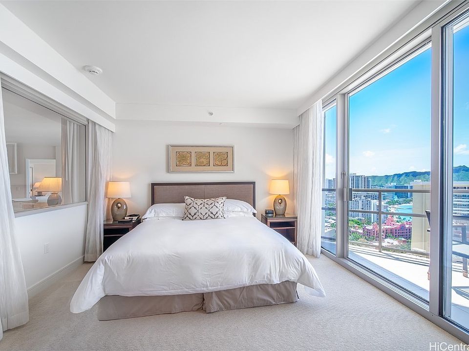 Desired High Floor and Diamond Head side spacious 2bedrooms with 3 full bathrooms with soaking tub, double sink, and full kitchen at a luxury resort-style hotel condominium in world famous Waikiki. Minutes from Waikiki beach, various restaurants, and shops. Unit comes fully furnished including kitchenware, with sleeper sofa to accommodate extra guests. From its large lanai, you will enjoy beautiful coastline and sunset views. Owner receives hotel services such as in-room dining, valet parking, concierge, and housekeeping upon request (service fees may apply). Amenities include swimming pool, fitness center, spa, bar, and restaurants.
