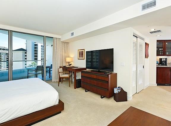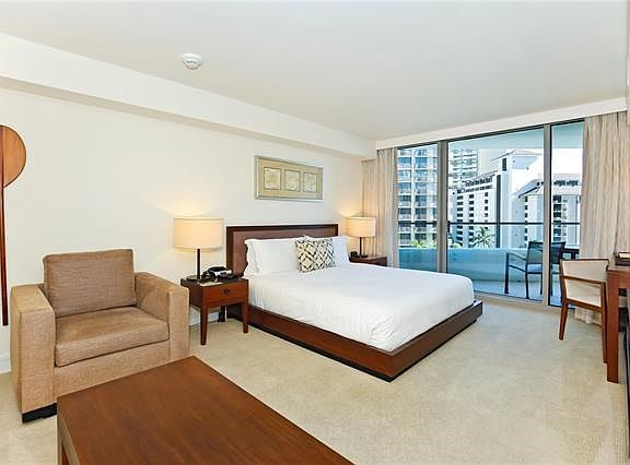 Luxury resort living in larger 5 star Trump Studio. Ocean and city views from this spacious lanai. Steps to white sandy beaches, restaurants and shops. Owners have valet privileges and can also rent out the fully furnished condo when not in residence.